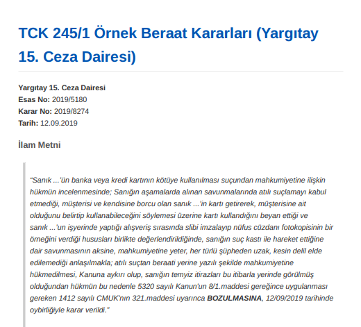 TCK 245/1 Örnek Beraat Kararları ( Yargıtay 15. Ceza Dairesi )